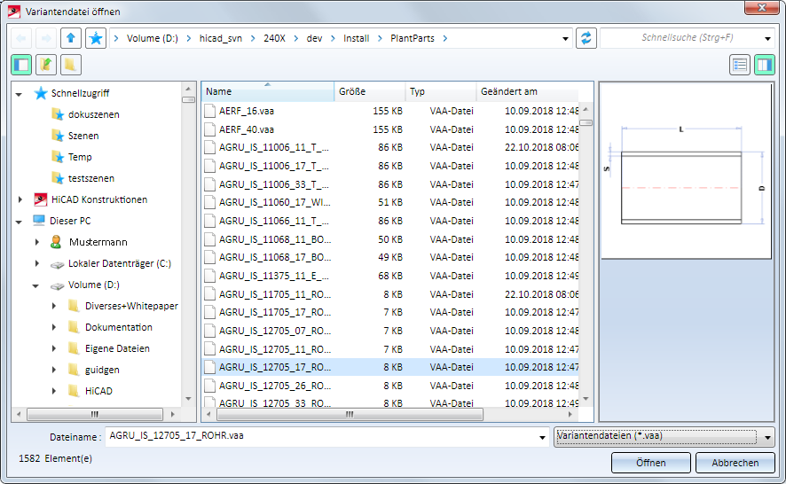Beachten Sie, dass das HiCAD-Verzeichnis PlantParts ausschließlich für den Anlagenbau gedacht ist. Bitte legen Sie daher keine allgemeinen Varianten in diesem Ordner ab, da diese Varianten einen anderen Aufbau haben als die VAA-Dateien im Anlagenbau!