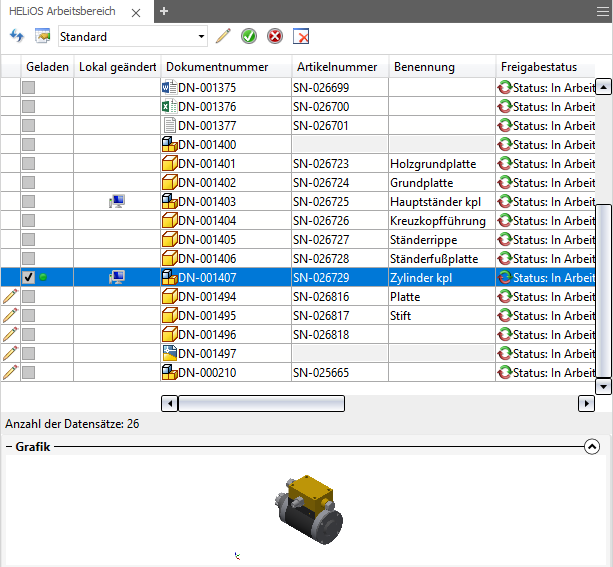 in der ersten Spalte der Ergebnisliste zeigt an, ob sich ein Dokument in Bearbeitung befindet. Ein Haken unter Geladen gibt an, ob das entsprechende Dokument aktuell lokal in Inventor geladen ist.