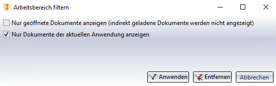 Verwenden um den Filter auszuführen. Daraufhin werden im Arbeitsbereich nur die aktuell geöffneten Dokumente gelistet.