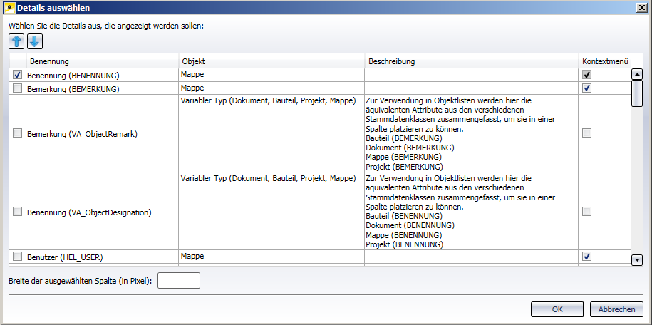 Mit den Pfeiltasten können Sie die Position des markierten Attributs ändern, und es weiter nach oben oder unten klicken. Die Reihenfolge von oben nach unten in der Auswahl-Liste entspricht dann der Anzeige (von links nach rechts durch Kommas getrennt) der Mappen-Attribute im Mappenexplorer.