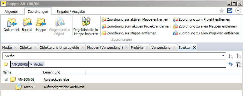 Verwendung zeigt eine Übersicht der Mappe als untergeordnetes Objekt weiterer Objekte (Mappen, Projekte), die auch in den Registerkarten Mappen (Verwendung) und Projekte spezifisch für übergeordnete Mappen und Projekte einzeln angezeigt werden kann.