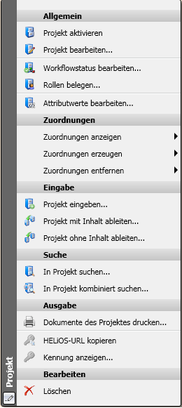 Die Bearbeitungsfunktionen eines Projektes finden Sie im Kontext-Menü, wenn Sie in einer Übersicht (etwa in der Baumstruktur des Projektexplorers oder einer Ergebnisliste) mit der rechten Maustaste auf das Projekt klicken.