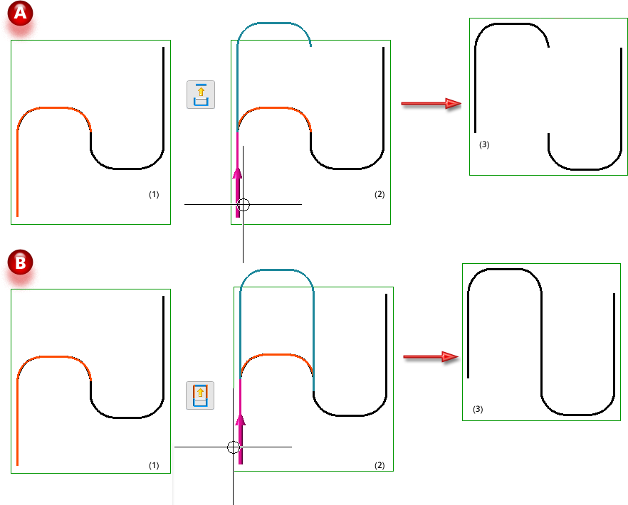 A: Linienelement einzeln, B: Verbundene Linien beibehalten und Länge anpassen, (1) Gewählte Linie, (2) gewählte Richtung, (3) Ergebnis