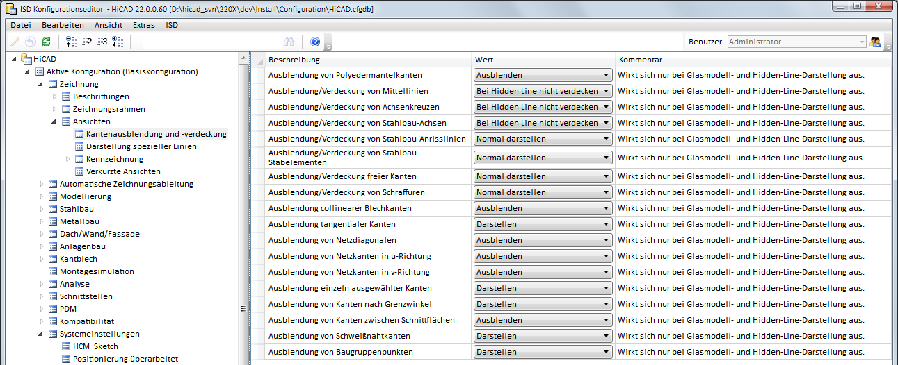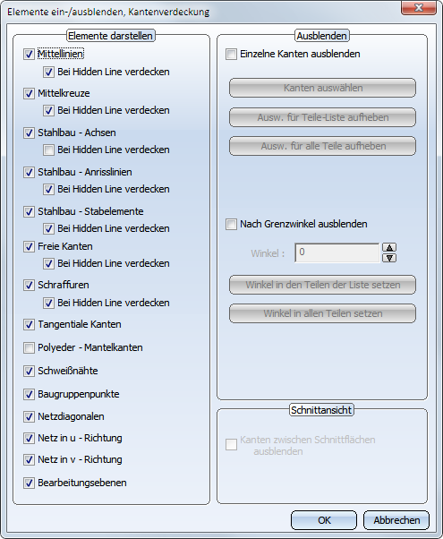 Die Voreinstellungen für dieses Dialogfenster lassen sich im Konfigurationsmanagement ändern und zwar unter Zeichnung > Ansichten > Kantenausblendung und -verdeckung.