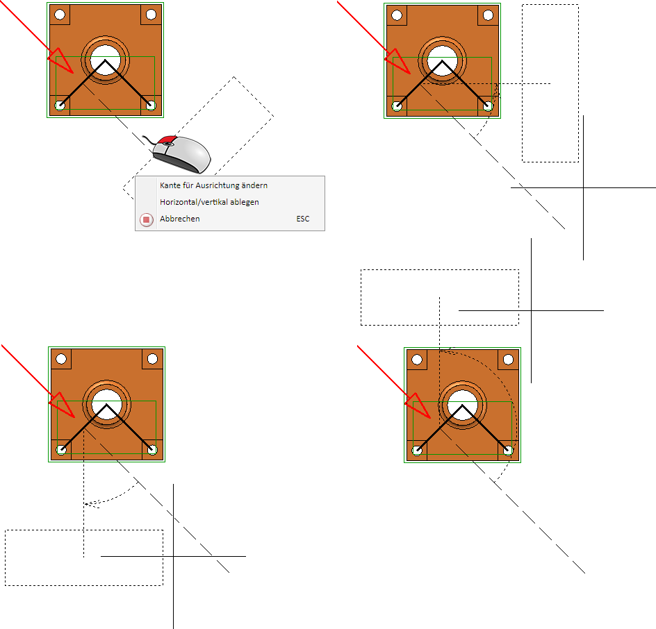 Mit dieser Funktion lässt sich die Schnittansicht horizontal/vertikal ablegen. Nach Aufruf dieser Funktion können Sie die Drehung - nach oben, nach unten, nach links oder nach rechts - mit dem Cursor auswählen und durch Absetzen des Cursors übernehmen. Die Blickrichtung des Schnittes wird im Moment des Funktionsaufrufes festgehalten, d. h. sie hängt davon ab, auf welcher Seite der Richtkante Sie mit der rechten Maustaste das Kontextmenü aufgerufen haben. Die folgende Abbildung zeigt verschiedene Varianten.