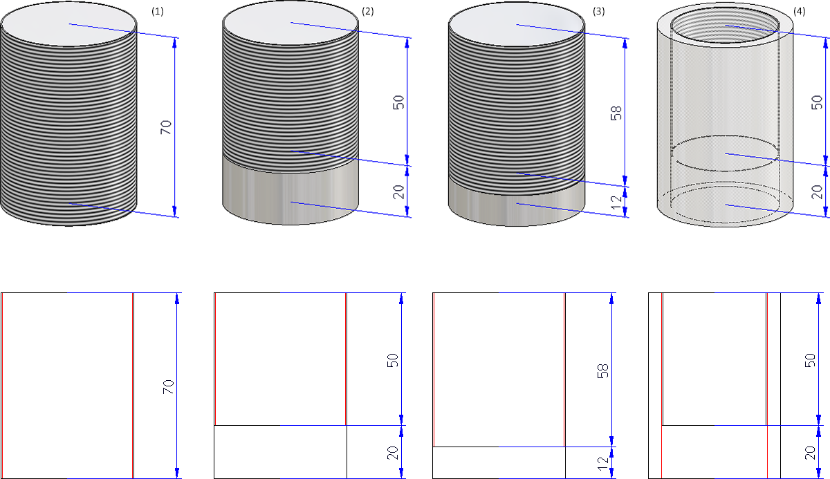 Hier wird die Gewindetiefe durch Bestimmung eines Punktes festgelegt. Ausgangspunkt für das Abtragen der Länge ist die Zylinderfläche, die bei der Auswahl der Mantelfläche näher am Cursor liegt. - Anfangsform / Endform
