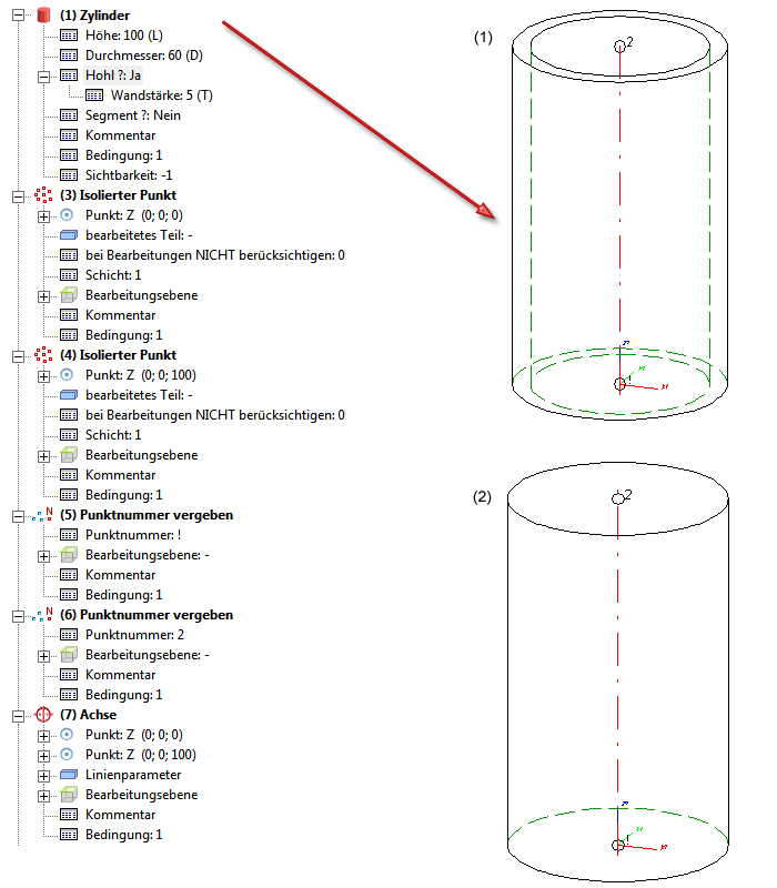 - Anlegen des Hohlkörpers wie abgebildet als Zylinder mit Höhe 100, Wanddicke 5, Durchmesser 60, Passpunkt in Absolut (0,0,0).