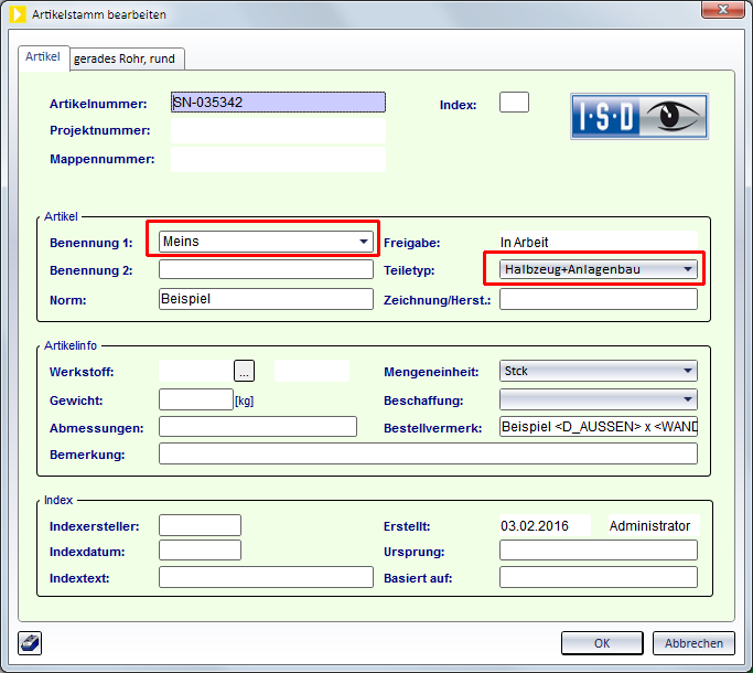 - Wählen Sie als Branche Standard-Anlagenbau und ordnen Sie die gewünschte Bauteilart zu.