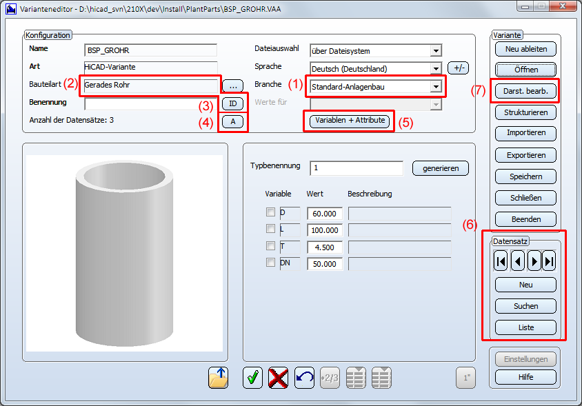 Funktion: Anlagenbau > Bauteildaten-Tools > Varianteneditor
