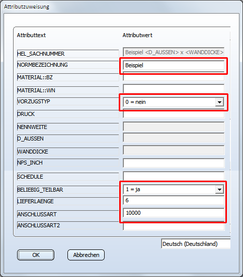 (5) Den Variablen der Variante werden nun die entsprechenden Attribute zugeordnet. Darüber hinaus muss die Nennweite noch eingefügt werden.