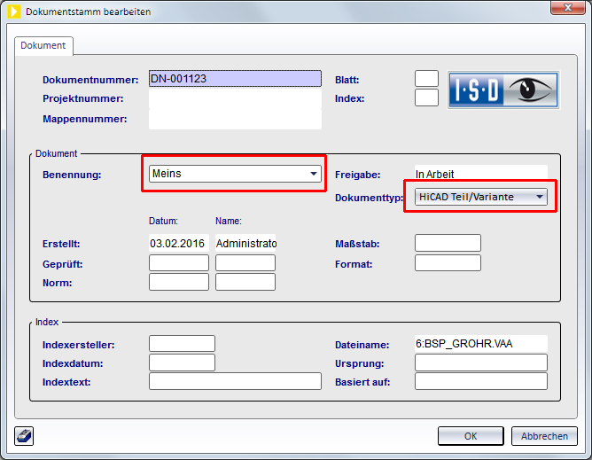 Fall 1: Bauteildatenquelle = HiCAD Katalog