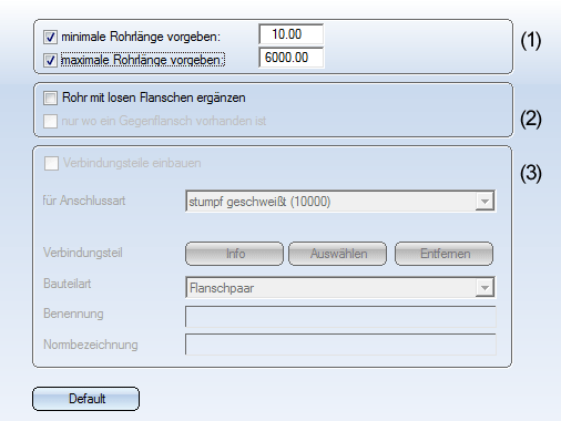 (3) Einstelloptionen für das automatische Einbauen von verbindenden Bauteilen zwischen geraden Rohren, im Fall dass die Leitkante länger als die maximale Rohrlänge (Lieferlänge) ist.