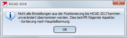 Soll die Konvertierung gestartet werden, dann wählen Sie OK. Der Ablauf ist dann analog zur Funktion Wechsel zur "Standardpositionierung seit HiCAD 2018.