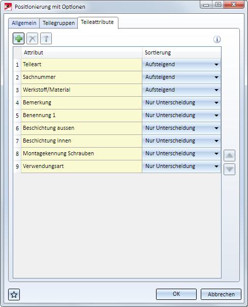 Hier bestimmen Sie, welche Teileattribute bei der Gleichteilerkennung und Positionierung berücksichtigt werden sollen.