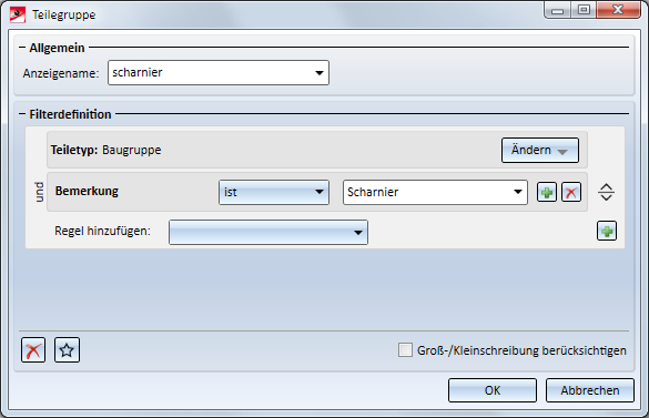 Nun lassen sich Regeln für den gewählten Teiletyp hinzufügen. Die Auswahl einer Regel erfolgt über die Listbox Regel hinzufügen. Diese enthält alle für den gewählten Teiletyp sinnvollen Attribute und Eigenschaften. Jede Regel - außer dem Teiletyp - besteht aus dem Namen des Attributes/ der Eigenschaft, einem Operator (ist, ist nicht, …) und mindestens einem Wert (Zahl oder Text).