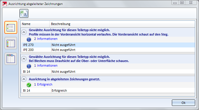 Das Ergebnis der Prüfung wird anschließend in einem Dialogfenster angezeigt. Hier ist aufgelistet, für welches der gewählten Profile / Bleche die neue Ausrichtung erfolgreich war und für welche die neue Ausrichtung nicht ausgeführt werden konnte.
