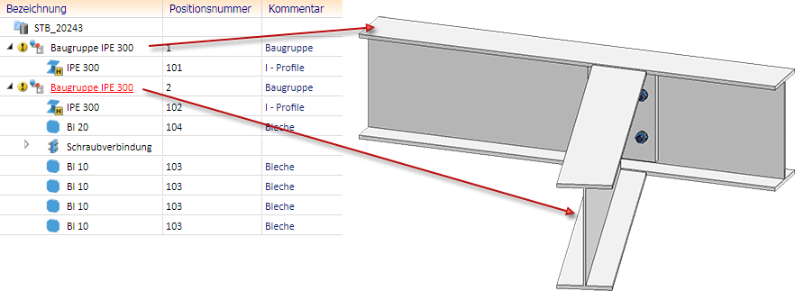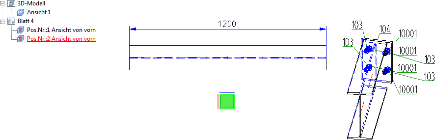 In der Werkstattzeichnung wird für Baugruppe 2 die mit der Funktion Vorderansicht gewählte Ansicht berücksichtigt. Auch hier wird dies entsprechend gekennzeichnet.