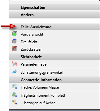 Für Baugruppen, allgemeine 3D-Teile, Profile sowie Kant- und Stahlbaubleche können Sie im Kontextmenü (RMT) mit den Funktionen unter Eigenschaften > Ausrichtung abgeleiteter Zeichnungen festlegen,