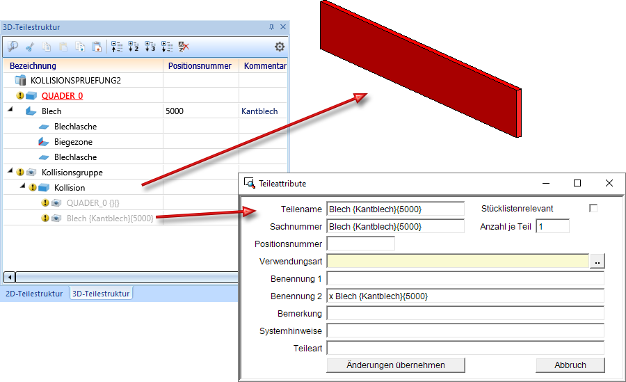 Für jede Kollision wird ein Kollisionsteil Kollision vom Typ Solid erzeugt mit der Geometrie der Kollision. Darüber hinaus enthält das Teil "Kopien" der beiden die Kollision verursachenden Teile. Diese Kopien sind Leerteile, die keine Geometrie und nur eingeschränkte Teileattribute haben. Diese Leerteile dienen einer schnelleren Klärung der Ursache der Kollision, da das Kollisionsteil unter Umständen sehr klein und optisch oft fast nicht sichtbar ist. Als Teilename und Sachnummer dieser Leerteile wird in der Regel der im ICN angezeigte Name des Ausgangsteils inkl. Positionsnummer und Kommentar verwendet. Eine Ausnahme sind Kollisionsteile, die keine echten Teile sind. In diesem Fall wird für das Leerteil der Name des übergeordneten Teils verwendet. Dies gilt für Gewinde, Blechlaschen, Biegezonen und Nebenteile von Baureihenprofilen. Alle Kollisionsteile sind nochmals unter dem Namen Kollisionsgruppe zusammengefasst.