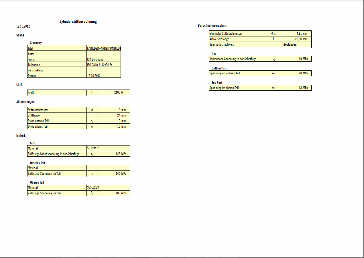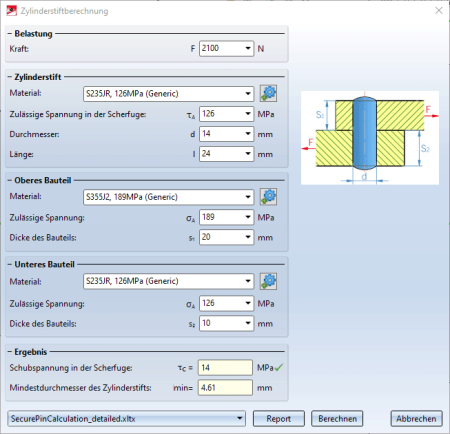 Mit dieser Funktion prüfen Sie, ob ein zur Verbindung von Teilen eingesetzter Zylinderstift unter Einwirkung einer Scherkraft die nötige Stabilität gewährleistet oder versagt. Die Funktion berechnet die Schubspannung in der Scherfuge und den Mindestdurchmesser des Stiftes.