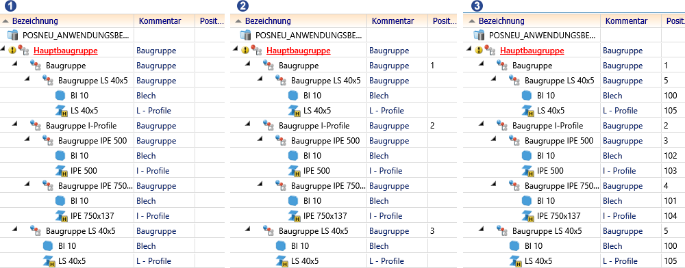 (1) Ohne Positionsnummern, (2) Positioniert im Modus Baugruppenweise, (3) Positioniert im Modus Konstruktionsweise