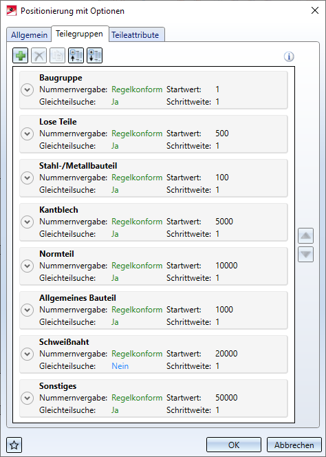 Wird die Konstruktion jetzt mit diesen Einstellungen positioniert, werden zuerst die Baugruppen, dann die losen Teile, dann die Stahl-/Metallbauteile etc. nummeriert.