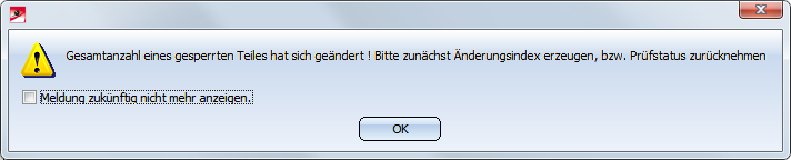 Bitte beachten Sie, dass diese Funktion nur dann sinnvoll ist, wenn im Konfigurationsmanagement unter PDM > > Fertigungszeichnungen der Parameter Gesamtanzahl in der Fertigungszeichnung berücksichtigen auf Nein steht. Anderenfalls erscheint beim Speichern der Konstruktion die folgende Meldung: