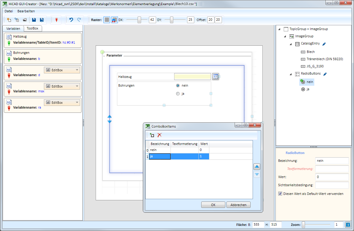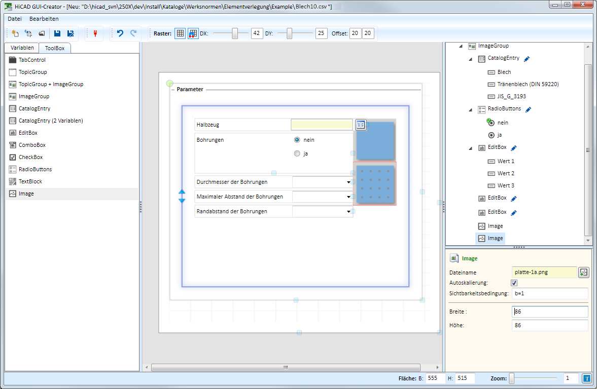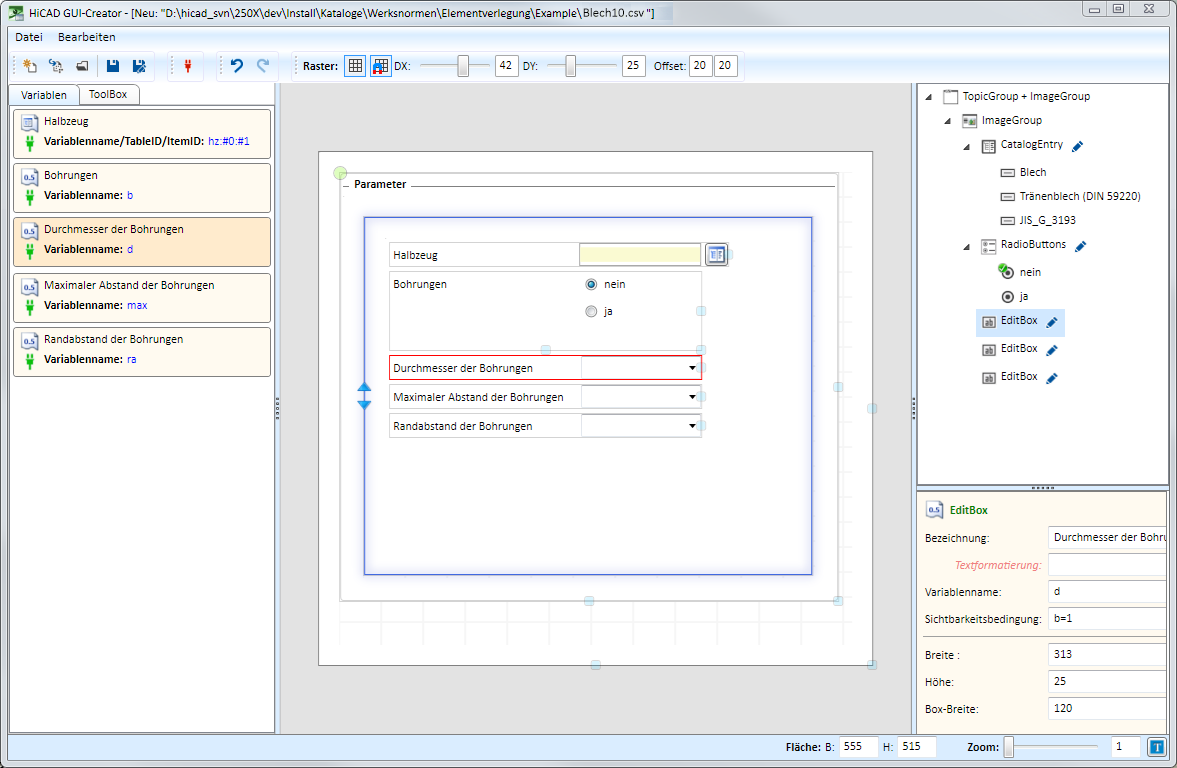Anschließend wird automatisch der DIalogeditor gestartet und die zur Variante Gebohrte Platte gehörende CSV-Datei (Blech10.CSV) geladen. Auf der Registerkarte Variablen finden sich dann alle für die Platte vergebenen Variablen wieder.