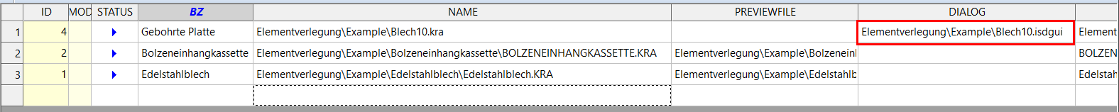 Um den Dialog verwenden zu können, muss er noch im Katalogeditor dem entsprechenden Verlegeelement zugeordnet werden, indem der Name des Dialoges (mit relativem Pfad) in die Spalte DIALOG eingetragen wirdz. B.