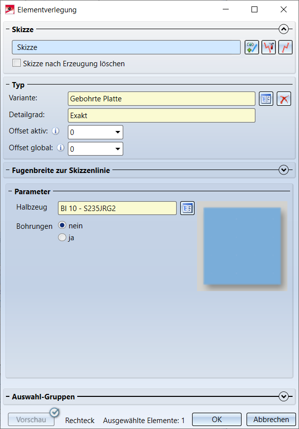 Nun kann der Dialog gespeichert werden. Die Datei wird automatisch im Katalog Werksnormen\Elementverlegung\Example abgelegt und zwar unter dem Namen Blech10.isdgui.