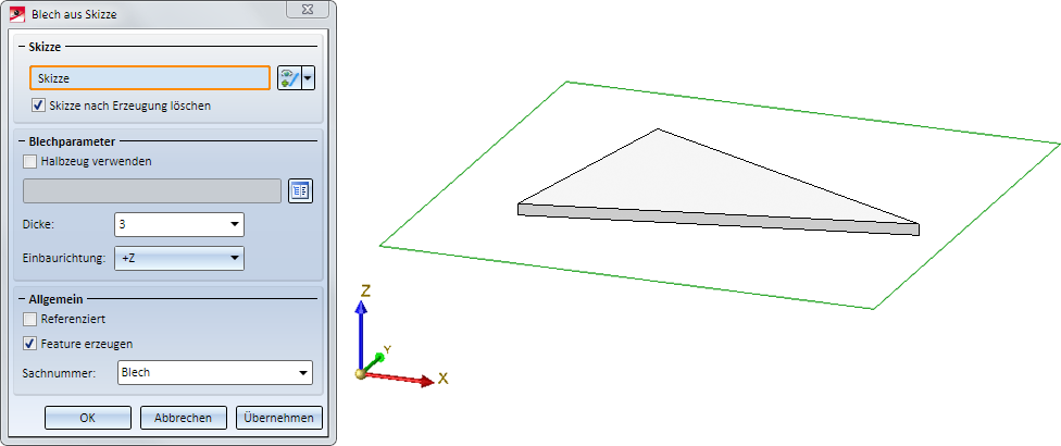 , wählen die Skizze aus, geben die Blechdicke an und verlassen das Fenster mit OK.