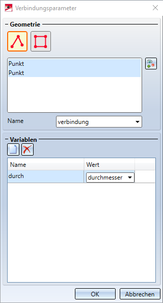 Achtung: Bei der Durchführung dieses Schrittes werden direkt Einträge in den Teilevariablen des gewählten Teils erzeugt. Sie müssen diese löschen, bevor Sie das Teil im Katalog speichern, da ansonsten eine spätere Verbindung scheitern würde.