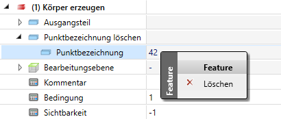 Einen Sonderfall stellen an dieser Stelle Teile dar, deren Featureprotokoll aktiviert wurde, als bereits Punkte und Punktnummern erzeugt waren. Wenn Sie in dieser Situation Punktnummern löschen, werden diese als eigener Eintrag Punktbezeichnung löschen am Körper erzeugen-Feature eingetragen. Hier können Sie einzelne gelöschte Punktnummern über die Kontextmenü-Funktionen Löschen löschen bzw. die ganze Liste über die Funktion Leeren löschen, wodurch die Punktnummern spätestens bei der nächsten Feature-Neuberechnung wiederhergestellt werden.