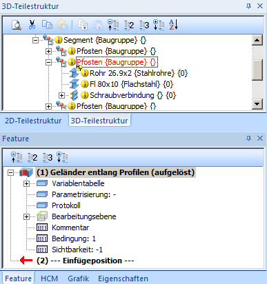 Durch ein weiteres Ausführen von Variante auflösen (in diesem Fall auf Geländer entlang Pfosten (aufgelöst)) beim Feature-Eintrag des entsprechenden Teils (es soll lediglich dieses geändert werden) ist es möglich, die tatsächlichen Features "freizulegen", die an der Stelle der erzeugten Geländer-Variante zugrunde liegen: Nach dem Auflösen sieht der Eintrag des Stahlrohr wie folgt aus: