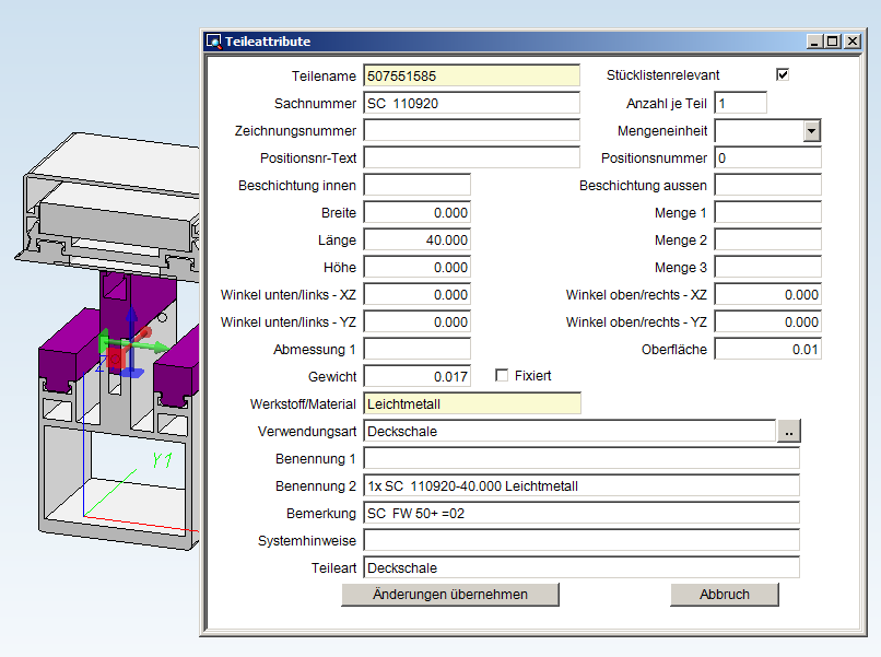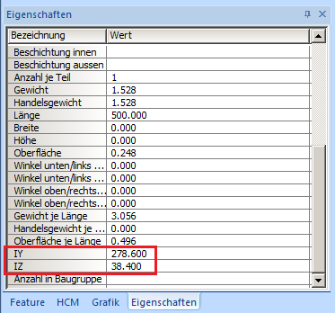 Geometriedaten wie Trägheitsmomente (IY, IZ) und Widerstandsmomente (WY, WZ) werden in HiCAD als Attribute übernommen und im Eigenschaften-Fenster angezeigt.