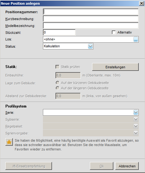 Hier sind entsprechende Angaben zu machen und eine Profilserie auszuwählen, bevor der Dialog mit OK bestätigt werden kann. Es folgen weitere LogiKal-Konfigurationsdialoge zum Einsatz, die vom Profiltyp und der Einsatzart abhängig sind.
