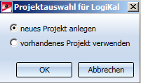Nach einer Auswahl und dem Bestätigen mit OK öffnet sich die LogiKal-Projektverwaltung. Wurde neues Projekt anlegen gewählt, ist hier nun der Name für das neue Projekt einzutragen, bei vorhandenes Projekt verwenden zeigt der Auswahldialog alle vorhandenen LogiKal-Projekte an.