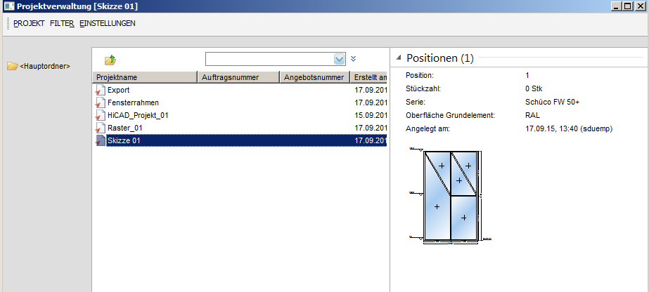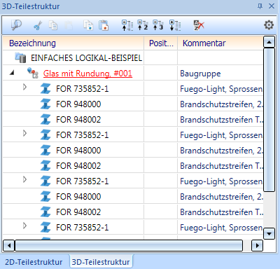 Der Projektname (hier im Beispiel "Raster_01") und die Positionsnummer (mit # davor gekennzeichnet) von LogiKal werden in der HiCAD-Teilestruktur angezeigt: