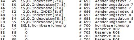 Es können auch Attributinhalte eines Artikelstamms, der mit dem Dokumentstamm des R+I-Schemas verknüpft ist, im Zeichnungsrahmen angezeigt werden. Dies wird erreicht, indem Sie in der Datei \hicad\sys\FLZVTXNR.DAT für jedes gewünschte Artikelattribut eine mit Reserve gekennzeichnete Zeile mit der Information zu diesem Attribut überschreibt. Hier im Beispiel wurde die Zeile, die mit Reserve R01 gekennzeichnet war, mit der Information zum Artikelattribut NORMBEZEICHNUNG überschrieben. Dabei ist B. das Kennzeichen dafür, dass es sich um ein Artikelattribut handelt.