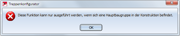 Voraussetzung für den Start des Treppenkonfigurators ist, dass die aktuelle Konstruktion eine Hauptbaugruppe enthält. Ist dies nicht der Fall, wird eine entsprechende Meldung angezeigt.