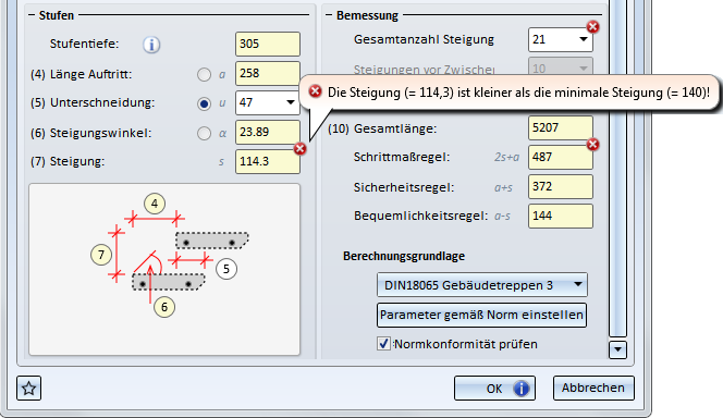 gekennzeichnet, die fehlerhafte Werte enthalten. Zeigen Sie mit dem Cursor auf das Symbol, um weitere Informationen zu erhalten und korrigieren Sie die Treppenparameter. Durch einen Klick auf die Schaltfläche Parameter gemäß Norm einstellen lassen sich die fehlerhaften Wert auch automatisch korrigieren.