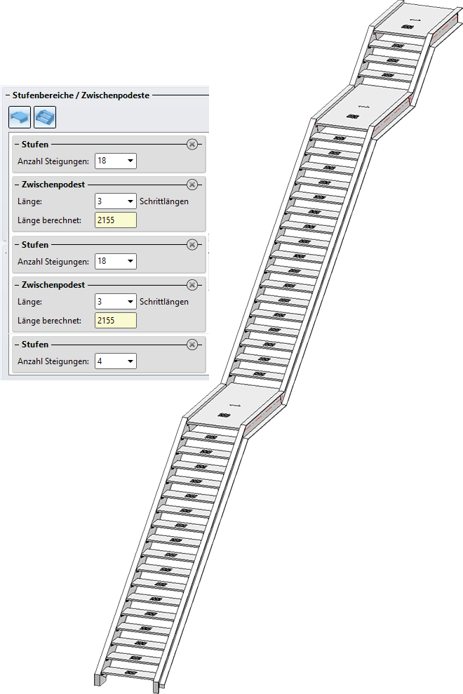 fügen Sie ein Treppensegment (Stufen) ein. Geben Sie die Anzahl der Steigungen ein. Beachten Sie, dass zwischen zwei Treppensegmenten immer ein Podest liegen muss.