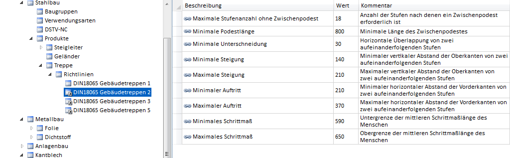 In der Listbox lässt sich die einzuhaltenden Richtlinie für die Berechnung auswählen. Diese Richtlinien, beispielsweise landesabhängige Vorschriften, werden im Konfigurationsmanagement unter Stahlbau > Produkte > Treppe > Richtlinien festgelegt. ISD-seitig sind hier Richtlinien nach DIN 18065 vordefiniert. Zur Definition weiterer Richtlinien klicken Sie im Konfigurationsmanagement auf der rechten Maustaste auf eine vorhandene Richtlinien und wählen im Kontextmenü die Funktion Struktur ableiten.