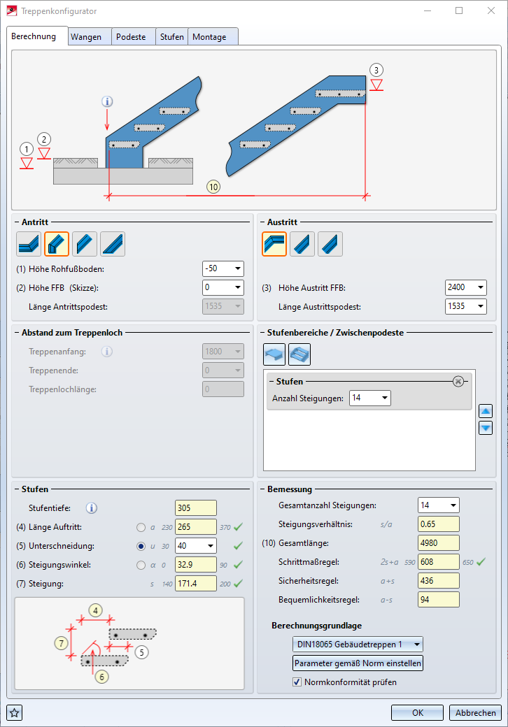 Mit dem Treppenkonfigurator lassen sich einläufige gerade Wangentreppen mit Zwischenpodesten erzeugen - sowohl mit als auch ohne Verwendung einer Treppenlochkontur. Dabei sind individuelle Einstellungen, wie diverse Wangen- und Stufenvarianten oder verschiedene Anschlussmöglichkeiten der Stufen an die Treppenwange ebenso möglich wie die Definition normgerechter Podeste.