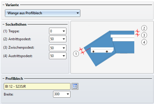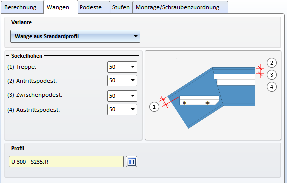 Wählen Sie - je nach gewählter Variante für die Wange - das Profil oder Blech mit einem Klick auf das Symbol