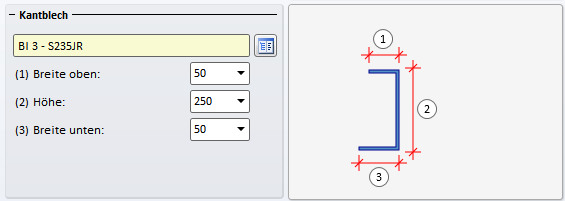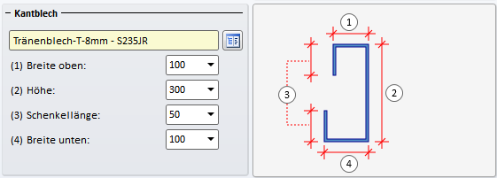 Im Fall von Wangen aus Kantblech U bestimmen Sie die Breite oben (1) und unten (2) sowie die Höhe (3).