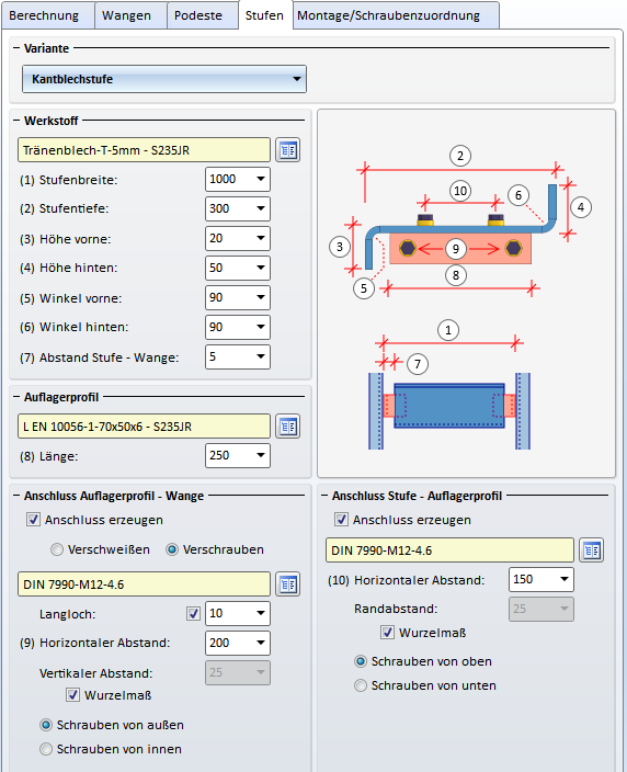 Soll ein Anschluss zwischen Auflagerprofil und Wange erzeugt werden, dann aktivieren Sie die entsprechende Checkbox. Der Anschluss kann durch Verschrauben oder Verschweißen erfolgen.