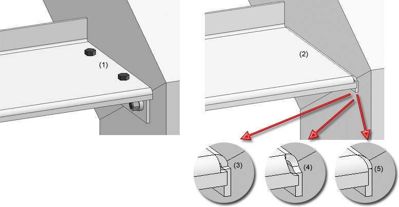 (1) Kantblechstufe, (2) Kantblechstufe ohne Auflagerprofil - Eckbearbeitung: rechteckiger Freischnitt (3), runder Freischnitt (4), geschlossen (5)
