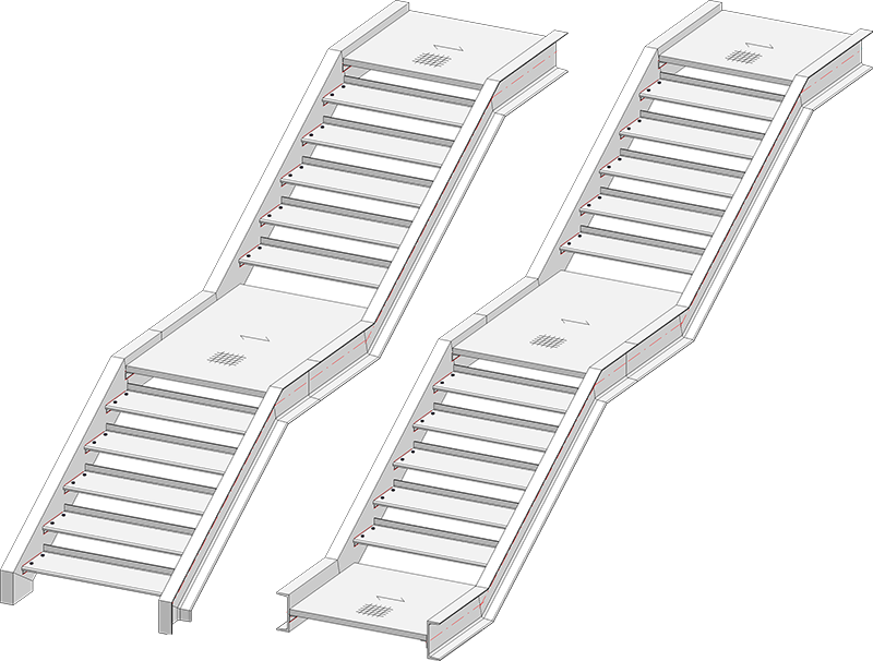 Links: Treppe mit Antrittswange als Stütze sowie Zwischen- und Austrittspodest, Rechts: Treppe mit Antritt-, Zwischen- und Austrittspodest