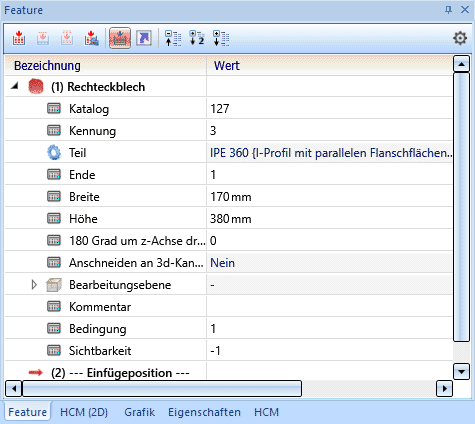 Auch bei Stahlbaukonstruktionen ist die Feature-Technik aktiv, d. h. in vielen Fällen wird der Konstruktionsschritt als Featureprotokoll aufgezeichnet.  Während der Konstruktion hat der Zustand dieses Feature-Protokolls keinen Einfluss auf den Dialog oder den Konstruktionsablauf mit HiCAD.
